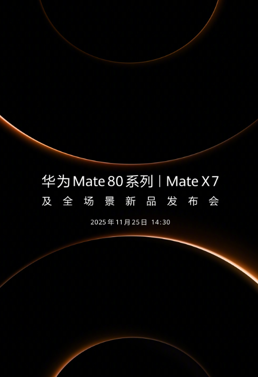 华为CEO、产品投资委员会主任、终端BG总裁余承东发布海报,并配文“来了!”微博上宣布,华为Mate80 lMateX7系列暨全阶段新品发布会将于2025年11月25日下午2点30分举行。